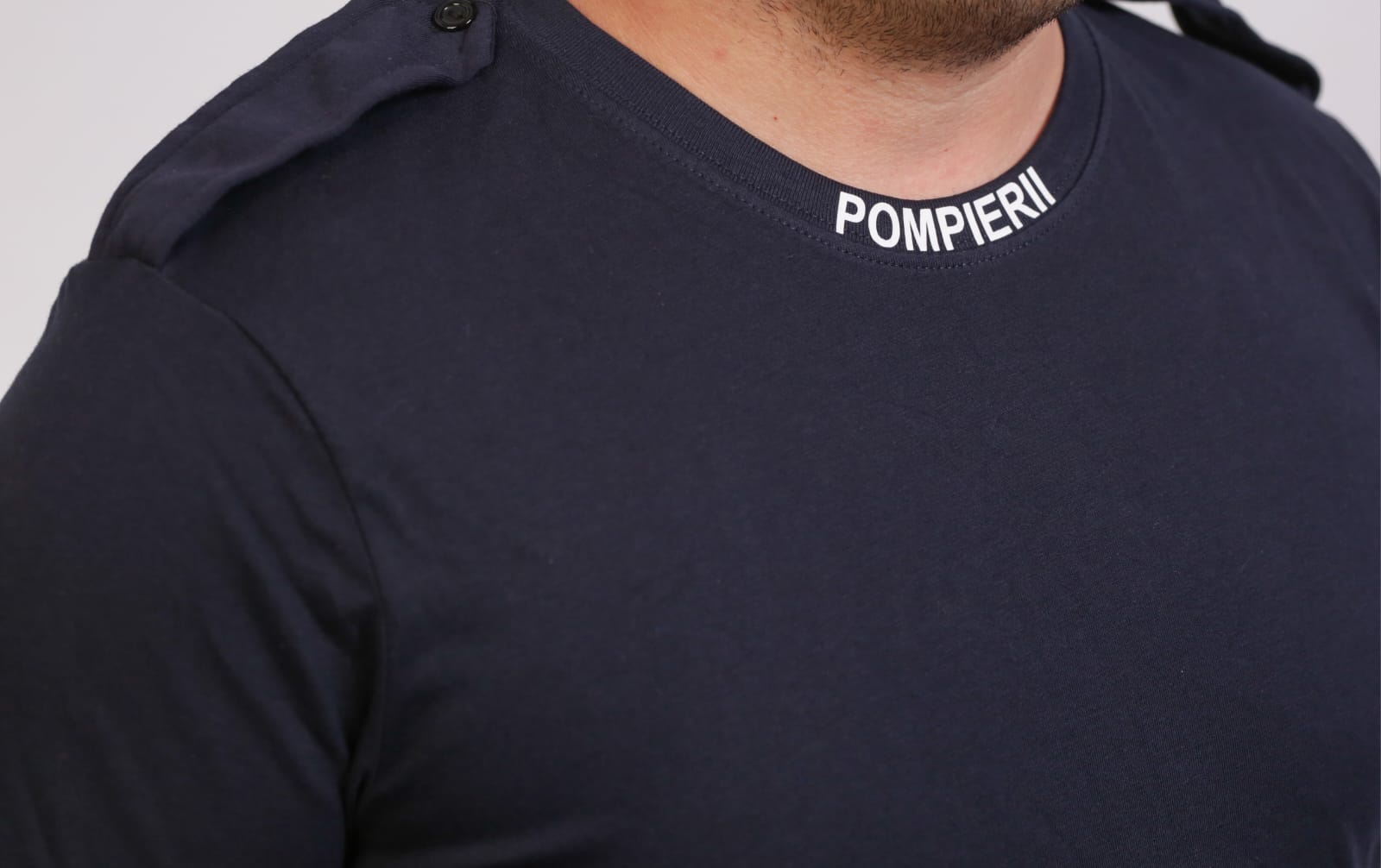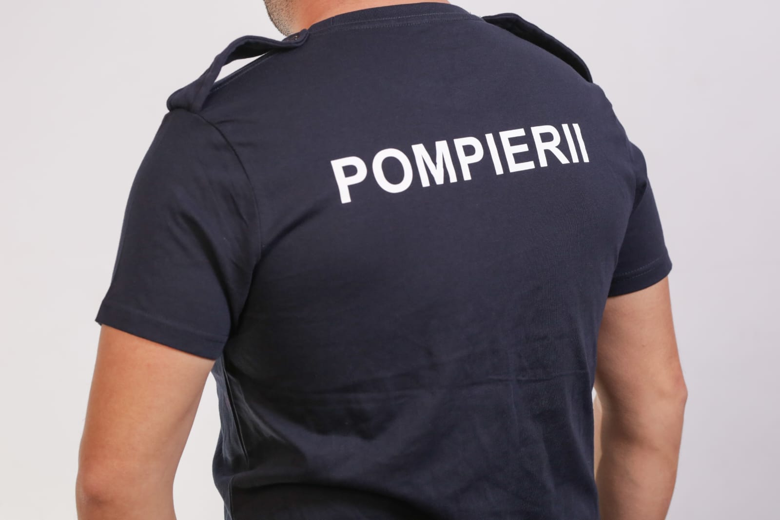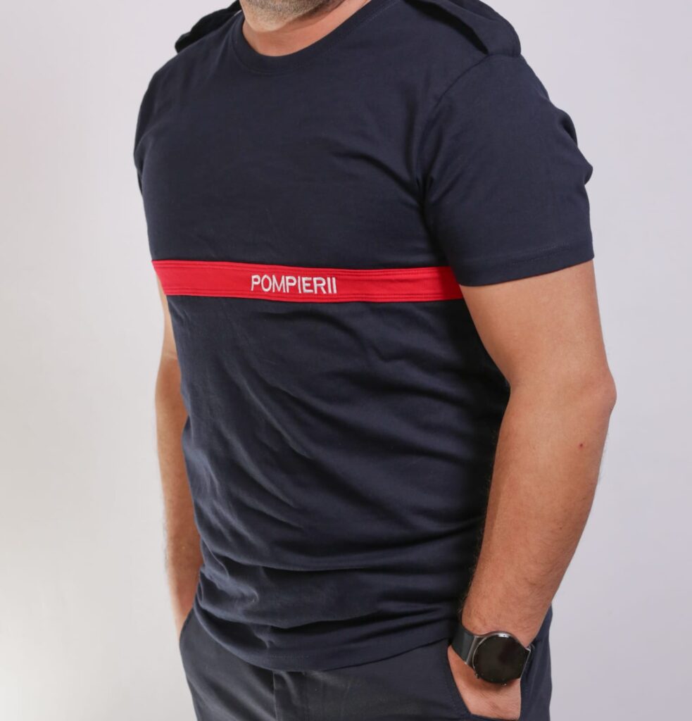 Tricou pompierii albastru inchis cu epoleti si inscriptie la baza gatului Material 100% Bumbac.